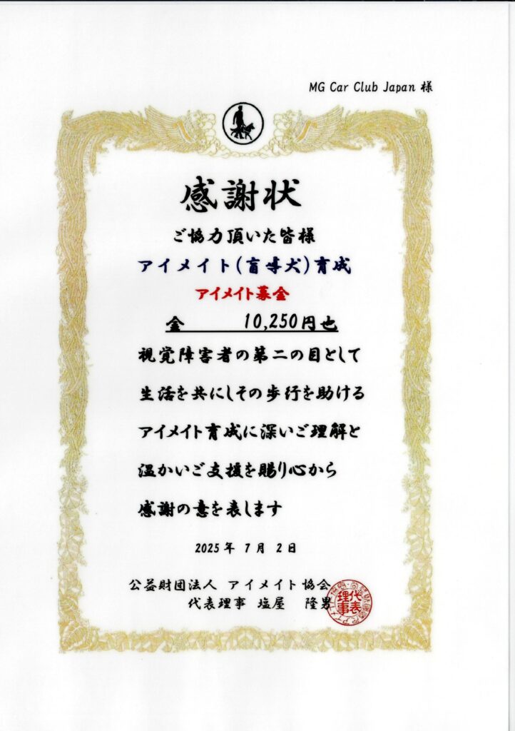 なお、本講演会の参加者からは盲導犬の育成プログラムへの寄付を頂き、育成組織の日本アイメイト協会から当クラブに感謝状が贈呈されております。